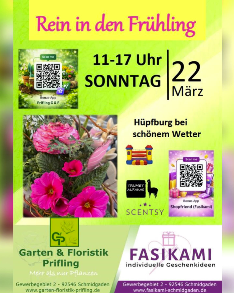 ✨ Mit dabei: 🎁 Fasikami – individuelle Geschenkideen 🦙 Trumet Alpakas 🕯 Scentsy 📍 Gewerbegebiet 2, 92546 Schmidgaden Kommt vorbei, lasst euch inspirieren und startet mit uns in den Frühling! 💚 #reindenfrühling #frühlingsmarkt #gartenundfloristik #fasikami #schmidgaden sonntagsausflug frühlingserwachen 🌼